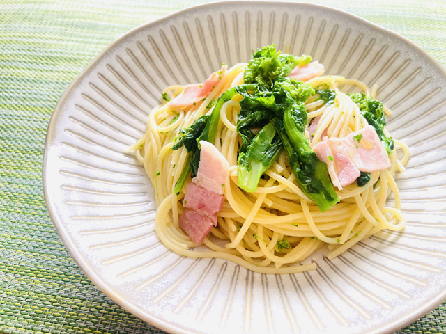 パスタを茹で、茹で上がる2分ほど前に菜の花(3センチ位に切る)も一緒にゆがきます。